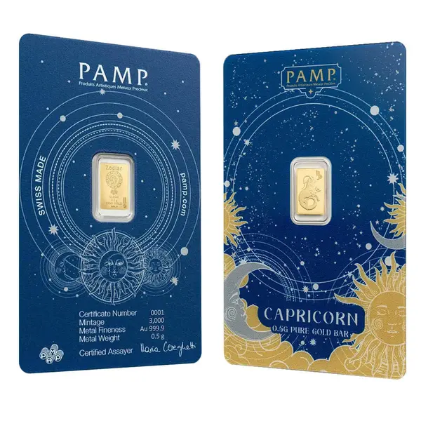 Compare the best price across the top bullion dealers for the 1/2 Gram PAMP Suisse Capricorn Zodiac Gold Bar. Minted from .9999 fine gold by PAMP Suisse—the world’s leader in refinery excellence—this bar is a centerpiece of the exclusive Zodiac Series, blending astrological symbolism with elite Swiss craftsmanship.