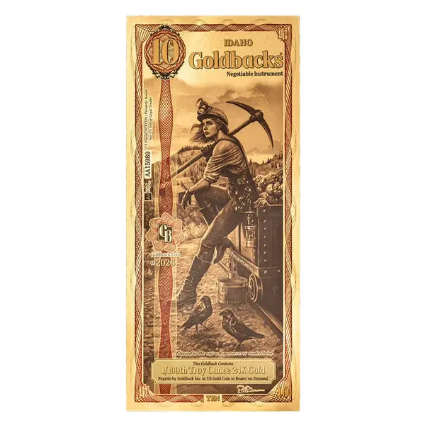 Compare prices online for the 10 Idaho Goldback at Bullion Hunters and find the best deals from dealers on this innovative gold currency. Each note contains 1/100 troy ounce of 24K (.9999 fine) gold, layered into a flexible aurum format that allows gold to be owned and exchanged in practical, fractional units.