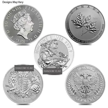 This product listing offers randomly selected 10 oz silver coins, chosen from a range of prestigious mints around the world. Depending on availability, your coin may come from renowned producers such as: