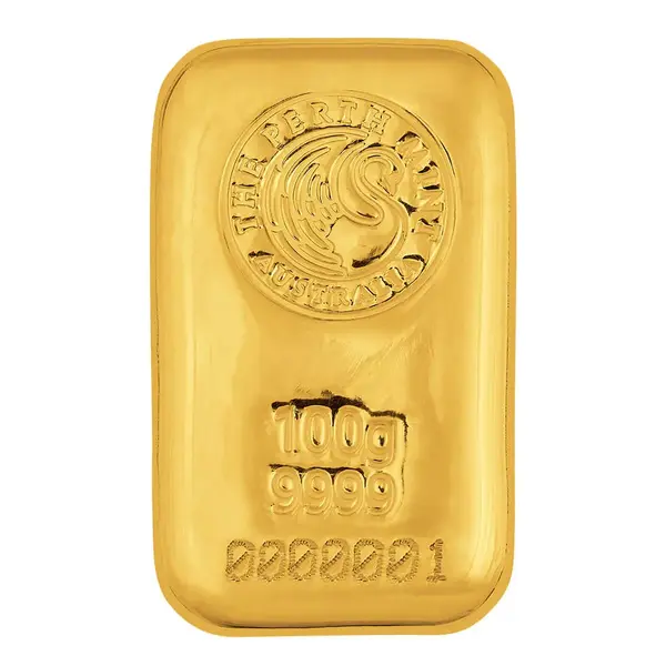 Each bar contains 100 grams (3.215 troy ounces) of .9999 fine gold, carefully poured and stamped with the Perth Mint’s hallmark logo—a majestic swan symbolizing integrity and excellence. Beneath it are clear inscriptions indicating the bar’s weight, purity, and unique serial number, providing guaranteed authenticity and traceability.