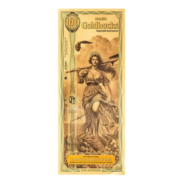 Compare prices online for the 100 Idaho Goldback at Bullion Hunters and find the best deals from dealers on this high-denomination fractional gold note. Containing 1/10 troy ounce of 24K gold, this aurum note represents one of the largest and most valuable issues in the Goldback series, combining real gold with innovative, flexible design. Goldbacks are created using advanced technology that layers pure gold into a durable note format, allowing for practical, portable ownership of physical gold while showcasing meaningful artwork tied to regional identity.